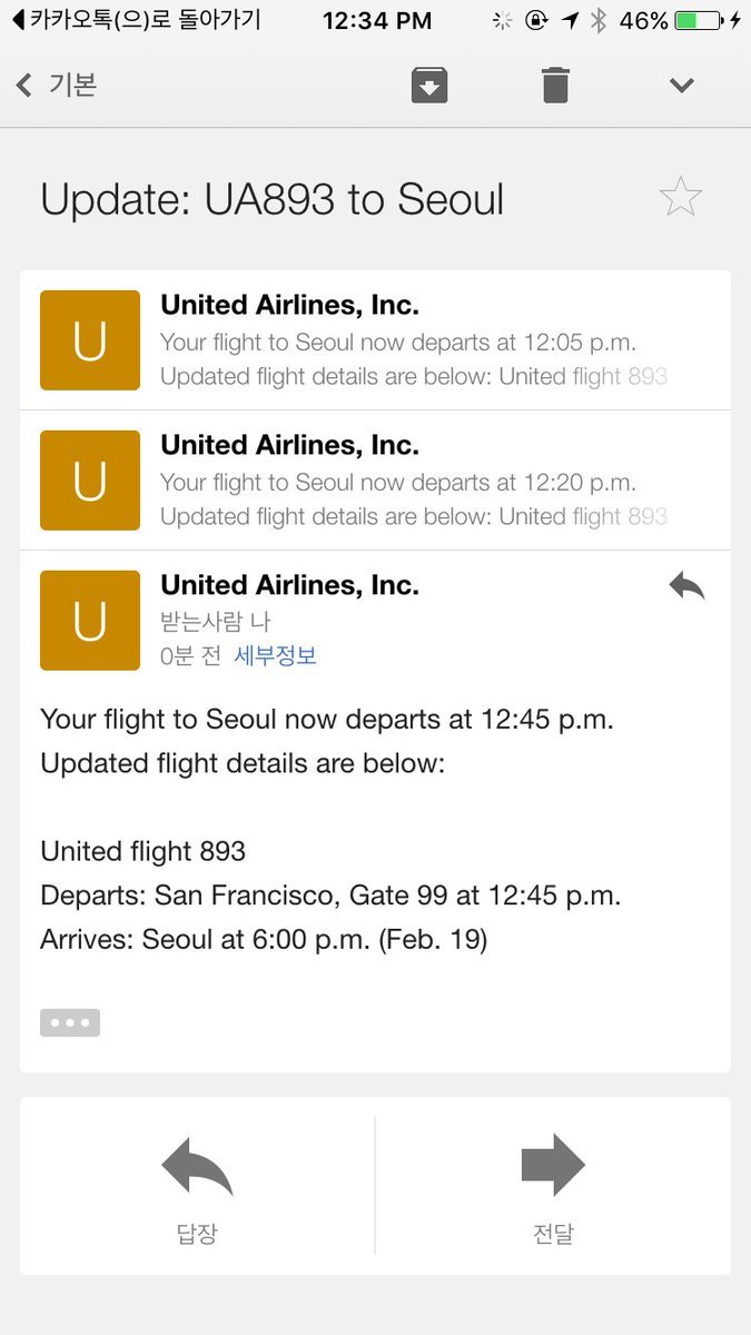아까 그 비디오 엔터테인먼트 시스템.. 어쩌고 그거 고쳤는데.. 비행기 제트 뭐시기에 문제가 추가로 발견됐다고 이번엔 왜 영어로 말해서 날 못 알아듣게 해. 계속 유나이티드에서 메일이 왔다. 이번엔 due to airport condition.. 12:05에 출발할 거라고 왔다.