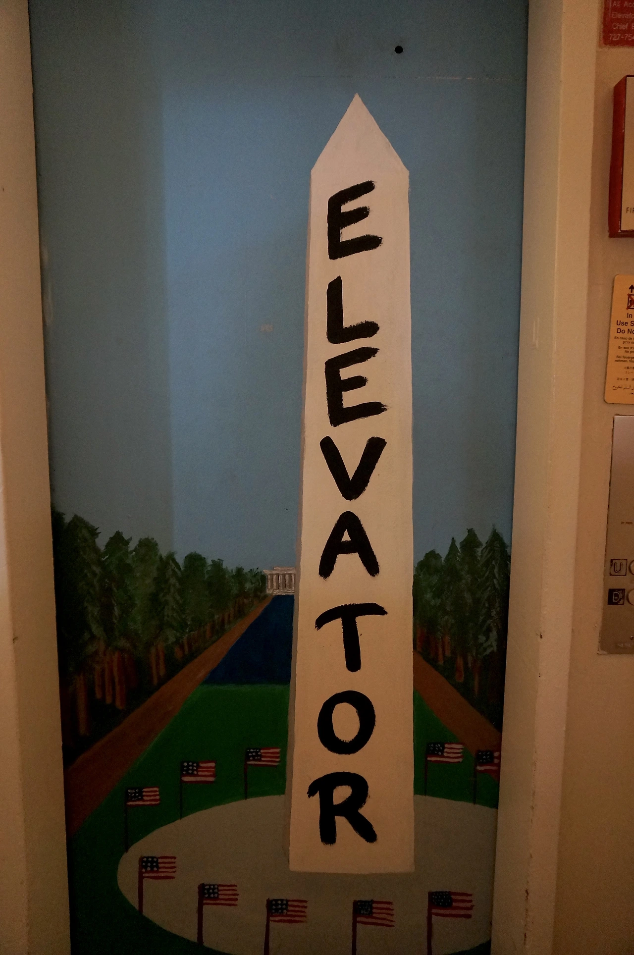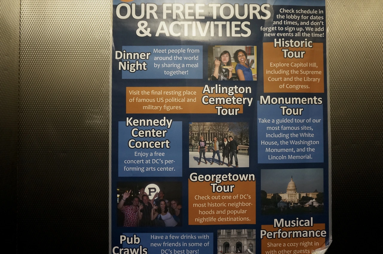 워싱턴 기념탑이 그려진 엘리베이터 안에는 호스텔에서 제공하는 가이디드 투어 정보가 있다.