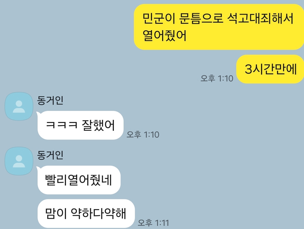 그리고, 이 상황을 실시간 중계받은 나의 친언니는 너무 일찍 문을 열어줬다며 내심 아쉬워했다. 역시 남의 집 부부싸움 구경이 가장 재미있는 모양이다.