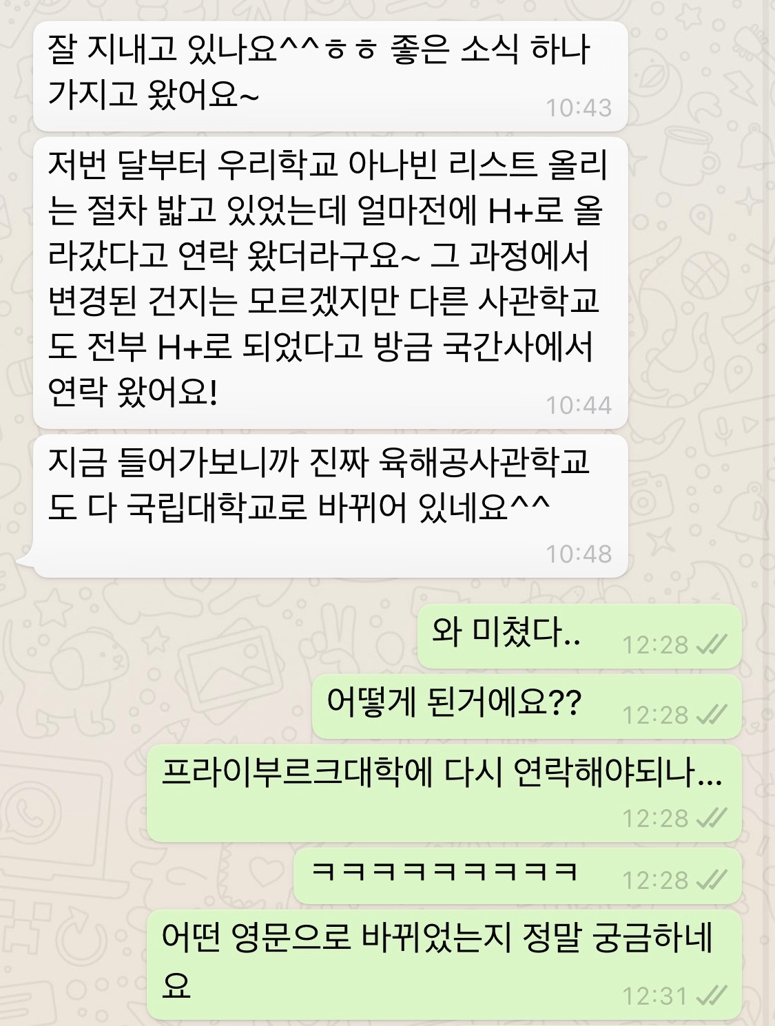 그리고 웬걸 오늘. 불과 1주일만에. 모든 사관학교 등급이 4년제 종합대학에 국립대학으로 등급이 바뀌었다고 연락을 받았다. 선배님은 어떤 행정절차가 있었는지 정확히 알 수는 없지만, 며칠 전 본인 학교만 4년제 종합대학으로 등록되어서 안타까워서 말을 못 하고 있었는데, 오늘 육해공군 사관학교 모두 4년제 종합대, 국립대로 바뀌었다고 알려주셨다. 나로선 개인이 할 수 없는 일이라고 포기했는데, 우리나라도 아니고 느리고 악명높은 행정을 자랑하는 독일의 시스템을 바꿨으니 정말 대단한 일이다. 할렐루야.