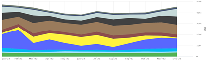<그림 2>는 작년 7월, 재생에너지 발전량에 따른 독일 전력공급의 변동에 관한 자료이다. 태양광은 노란색이고, 풍력은 파란색, 도표의 ⑦,⑧,⑨,⑩으로 표시한 색은 원자력 및 화력발전에 해당한다. 한낮에는 태양광 발전량이 많고, 밤에는 파란색인 풍력 발전량이 늘어난다. 한편, <그림 3>의 2022년 월별 발전량을 살펴보면, 일조량이 거의 없는 겨울에는 태양광 발전량은 거의 없는 반면, 풍력 발전량이 더 늘어나는데, 태양광과 풍력을 조합하면 재생에너지 변동성을 어느 정도 상쇄할 수 있다는 점을 알 수 있다.
