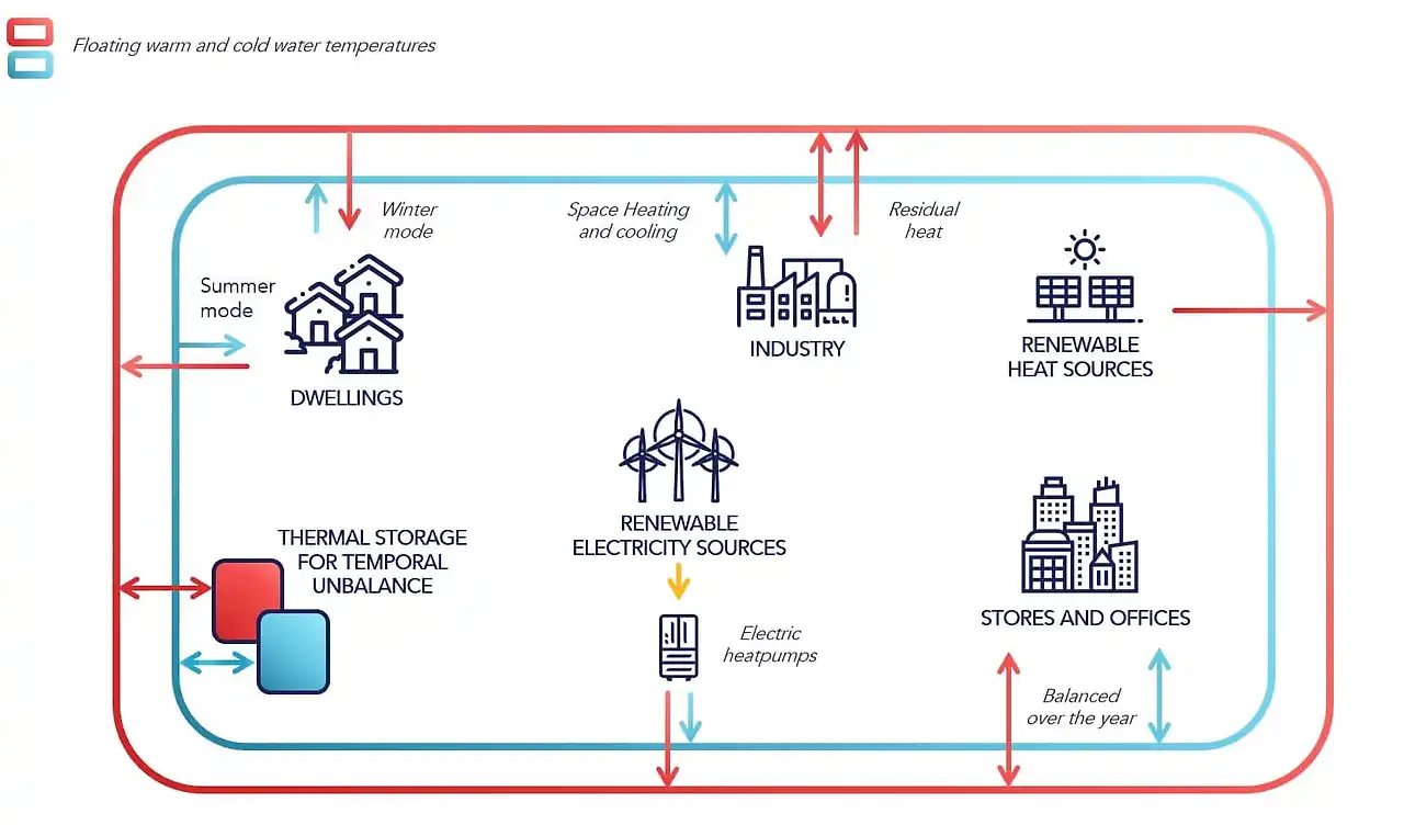 위의 개념도는 냉난방을 단순히 각각의 수요로 보는 게 아니라, 냉방이 필요한 곳에 냉방을 하고 그 폐열을 난방에 필요한 곳에 공급하는 방식 등을 통해 에너지 효율을 극대화하는 개념을 도식화한 그림이다. 마치 4차산업혁명이라고 하는 것처럼 이를 5GDHC(5th Generation Distrcit Heat and Cold)라고 하는데, 건물 분야의 탄소중립을 위해선 이런 접근 방식이 아니고서야 불가능한 일일지도 모른다. 이뿐만 아니라 각 분야를 따로따로 접근하는 것이 아닌 여러 분야를 연결하는, 즉 재생에너지를 통한 발전, 운송, 건물, 산업 분야를 연결하는 섹터 커플링이라는 개념도 많이 논의되는데 이런 조치가 점점 더 필요한 건 자명한 일이다.