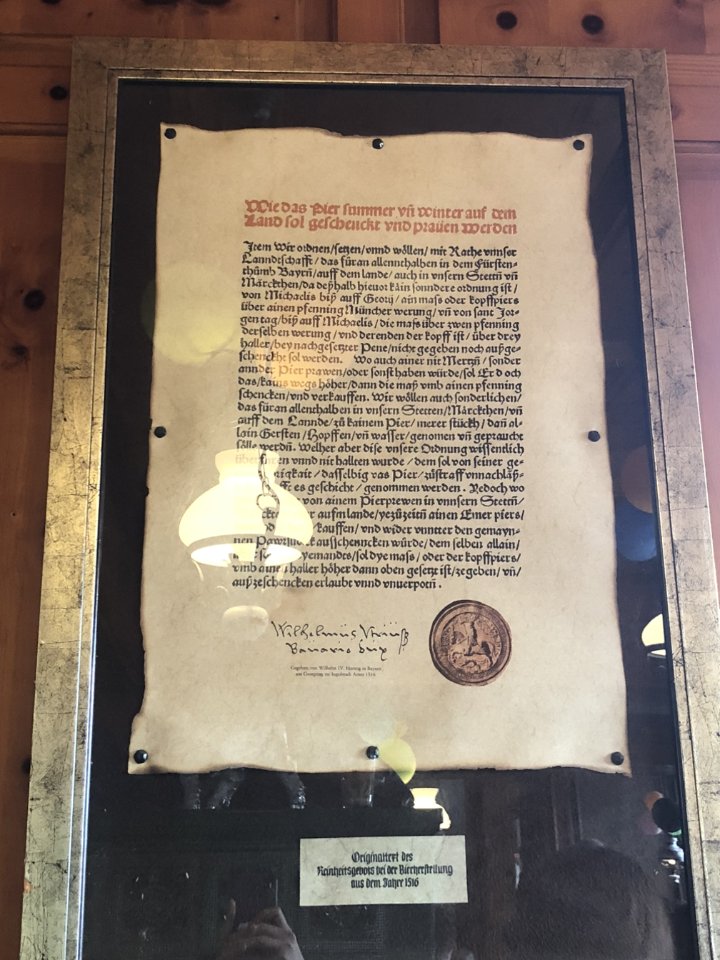 당일 역시 사육제 기간 중 하나로, 사람들이 정말 많았지만 아주 운 좋게 그곳에서 식사를 할 수 있었고, 우리가 앉은 자리 위에는 그 옛날 바이에른 공작으로부터 서명받은 맥주순수령이 액자에 걸려 있었다. 바이에른에서만 맥주를 먹는 이태리인은 바이에른이 다 되었는지 이곳 맥주는 다 별로라고 했는데, 여기만큼은 그래도 나쁘지 않다고 이야기한다. 그러고 보면, 나도 그런 시각을 갖고 있었는데, 어느 순간 이 동네의 맥주에 길들여져 최고의 맥주를 맛본 지 오래됐다는 생각도 든다.