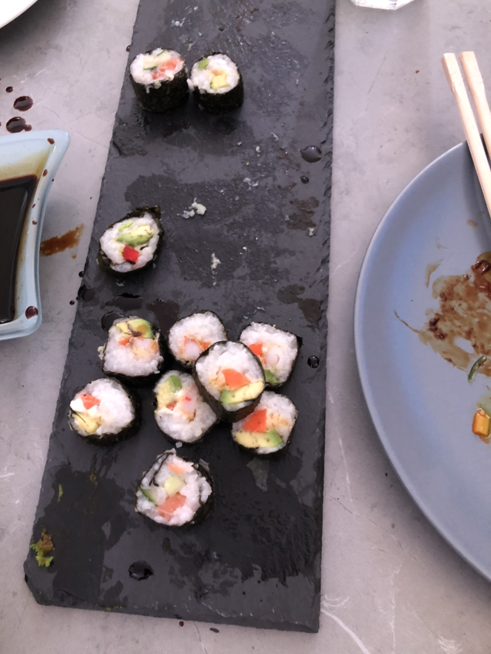 밥이 되는 때까지 시간이 걸리는지라 남는 시간에 한국 보드게임을 알려주기로 했다. 공기는 숙달이 필요하기에 제일 쉬운 윷놀이부터 알려줬다. 재밌다고 한다. 상대편 말을 잡고, 다시 한번 하는 걸 특히 즐거워했다. 밥이 되자 김을 두르고 밥을 하는데, 말은 스시지만 내겐 김밥일 뿐이다. 김밥 안에 연어, 새우, 아보카도, 당근 등을 넣는다. 한국 김밥이 그리운 순간이었다.