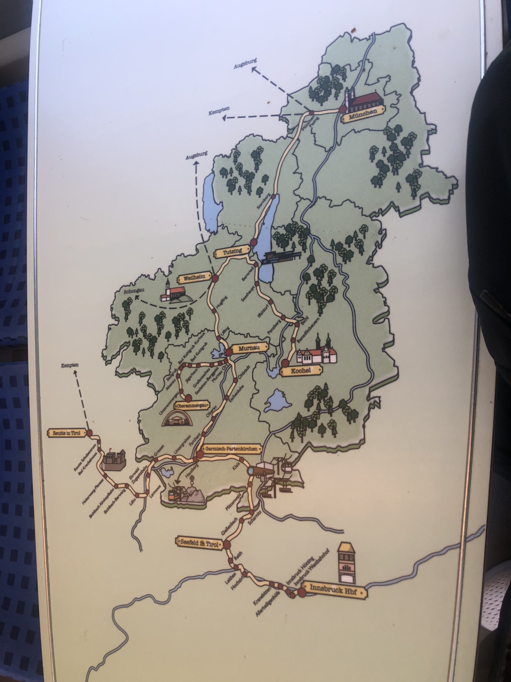 재밌는 건 독일에서 독일로 이동하는데 기차가 독일에서 오스트리아로, 다시 독일로 돌아간다. 이는 알프스의 험준한 산이 국경을 따라 기찻길을 만들기 어렵게 만들었기 때문일 테다. 이 교통편은 아마도 아주 멋진 경치를 보여주지 않을까 기대해본다.