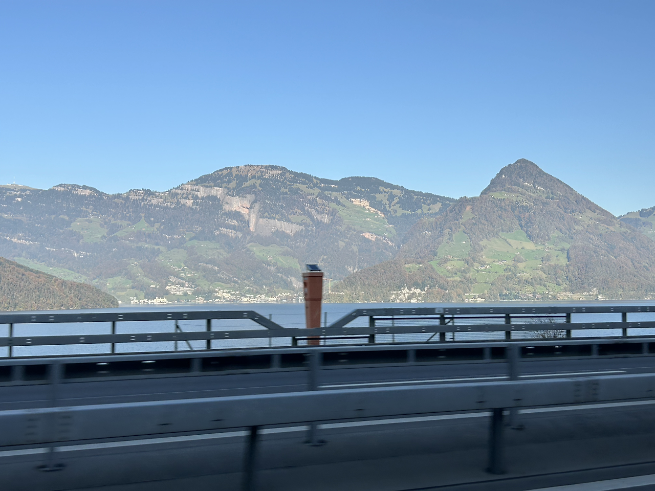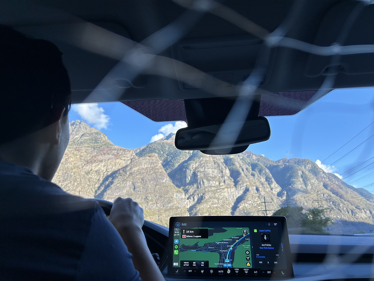 독일의 아우토반을 지나, 스위스에 접어들고도 한 시간은 힘들어하던 녀석이 어느 순간 온순해진다. 스위스의 평화로운 자연과 그전보다 본인이 보는 차량이 적기 때문이었을까. 알 수 없다. 노곤노곤해진 녀석은 어느새 잠이 들었다. 그렇게 두 시간은 아주 평화롭게 스위스를 지나갔는데, 그 풍경이 정말로 장엄하고 아름다웠다. 확실하진 않지만, 유럽의 최고봉 융프라우를 비롯한 알프스 고봉들의 능선을 지났으며, 알프스에서 내려온 빙하로부터 형성된 수많은 호수가 우리를 반겼다. 그리고 그 풍경 속에 스위스 특유의 마을과 곳곳에 우뚝 솟은 상대적으로 낮은 돌산들과 폭포 등이 기억에 남는다. 그런 풍경은 마치 우리나라로 따지면 지리산 주변의 산청과도 비슷한 느낌이었다. 스위스 사람들은 이에 공감할지는 모르겠지만.