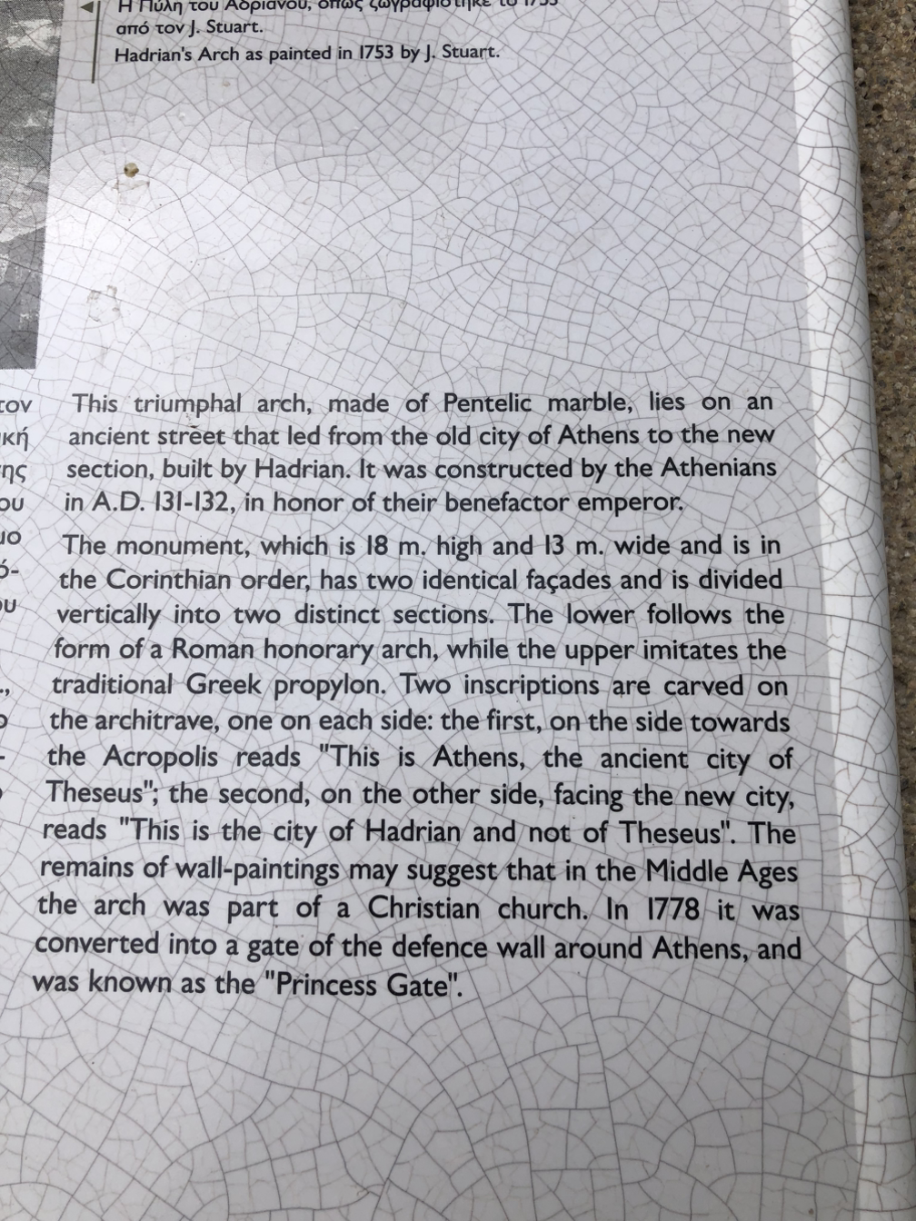 그곳을 떠나 올림픽 경기장으로 향한다. 가는 길에 보이는 로마의 오현제 중 하나였던 하드리아누스의 문과 제우스 신전도 잠시 살펴본다. 앞면에는 “This is Athens, the ancient city of Theseus”, 반대편에는 “This is the city of Hadrian and not of Theseus”라고 적혀있다. 베를린의 브란덴부르크 문이 베를린과 브란덴부르크를 구별하는 것처럼, 하드리아누스의 문도 고대 아테네와 본인이 건설한 도시와의 구분과 같은 개념이었겠거니 싶은 생각을 함과 동시에 정복자의 여유도 엿볼 수 있었다.