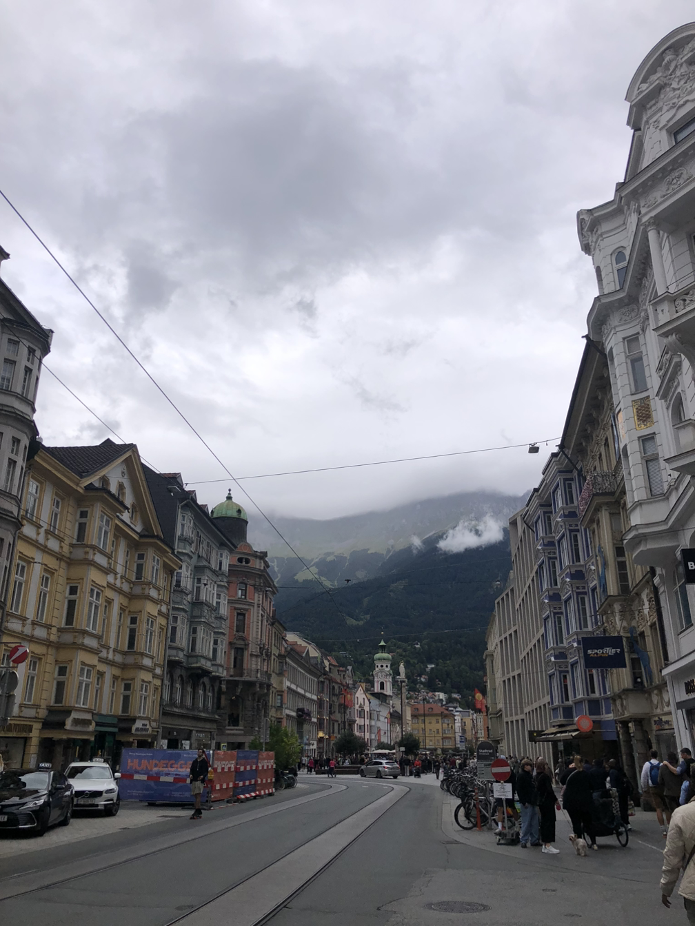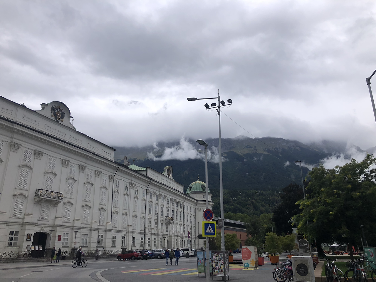 두 시간 반 정도 지나니, 아름다운 잘츠부르크를 지나, 멋진 풍경이 나오며 목적지인 인스부르크에 출발한 지 네 시간 정도 후에 도착했다. 일단 짐부터 숙소로 끌고 가는데 저 멀리 해발 2300m의 알프스의 봉우리가 도시 뒤에 배경으로 자리 잡는다.