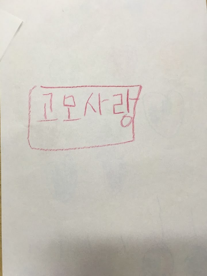 <사진: 짱구 6살이 되는 1월, 8월에 있는 본인 생일파티 초대장을 보내줬다. 8월 생일파티 후 그림 그리기 놀이하다가 짱구가 써서 준 글 ‘고모사랑’>