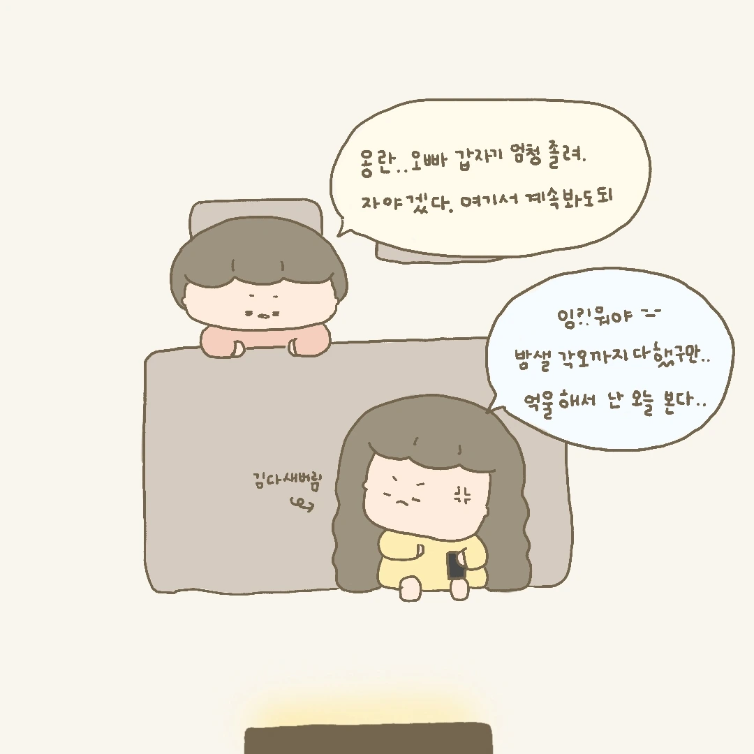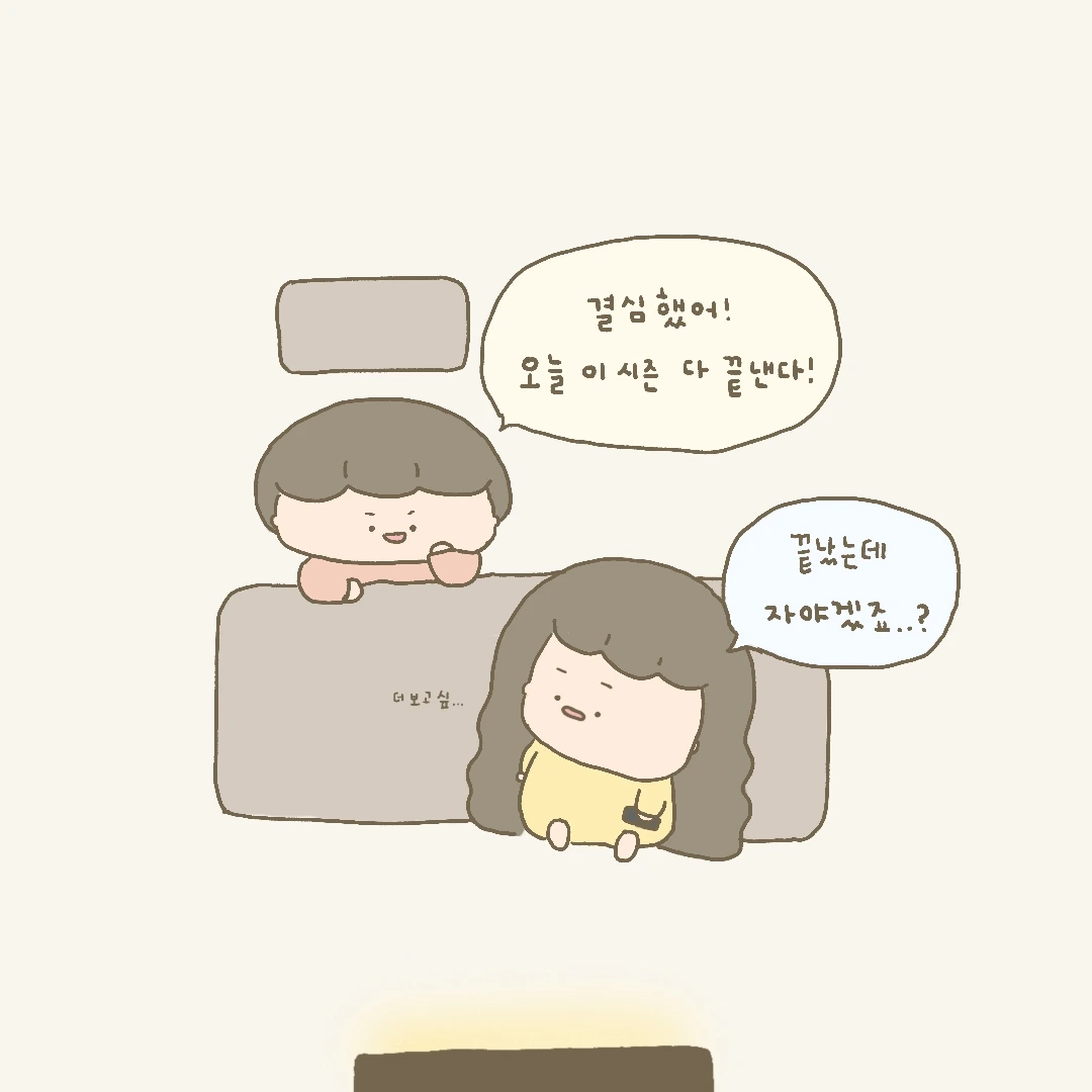 그 짧은 몇 마디에 나는 밤샐 각오와 내일 할 일 스케줄 정리를 몇 분 새에 끝내 놓은 후 , 다 볼 생각에 우주의 온 기대를 다 품으니 다시는 오늘 다 본다, 끝낸다 말하지 마십쇼..