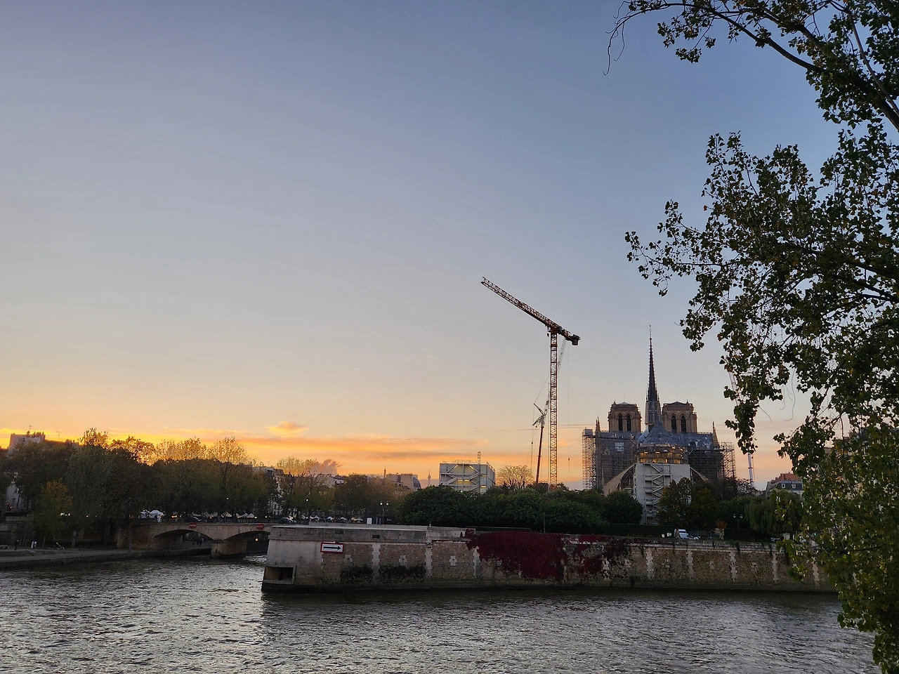 공사중인 노트르담 사원뒤로 노을