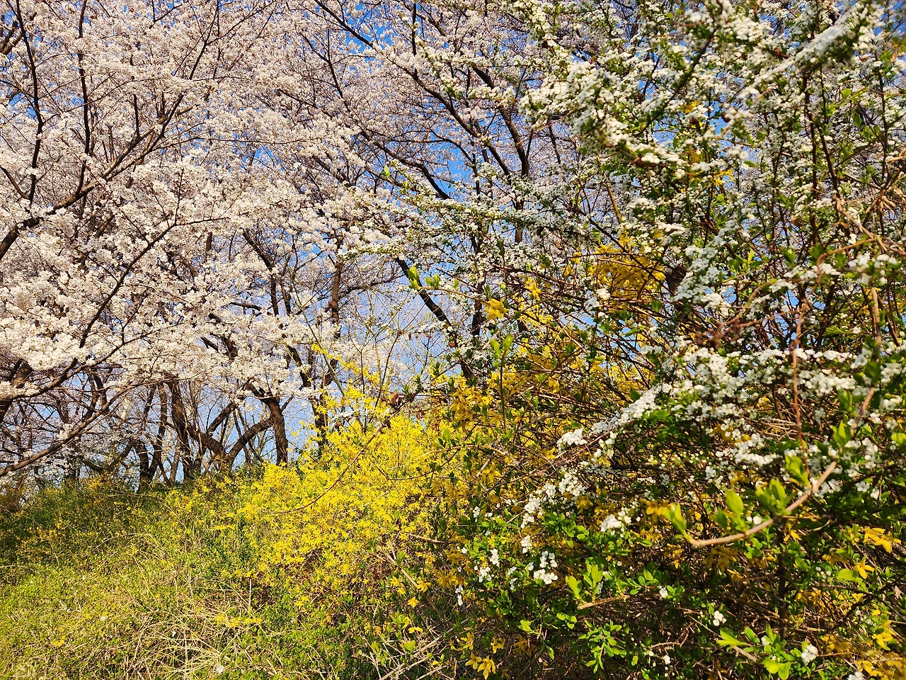 벚꽃과 개나리가 어우러져 피어있고 이름을 모르는 하얀 잔이파리 꽃들도 같이 피었다.