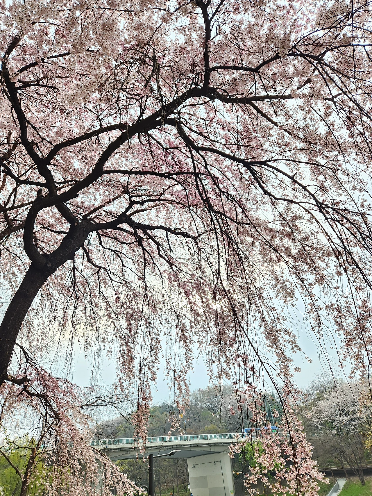 오늘 아침엔 지나며 보니 늘어진 꽃가지들이 마치 꽃우산 같았다.