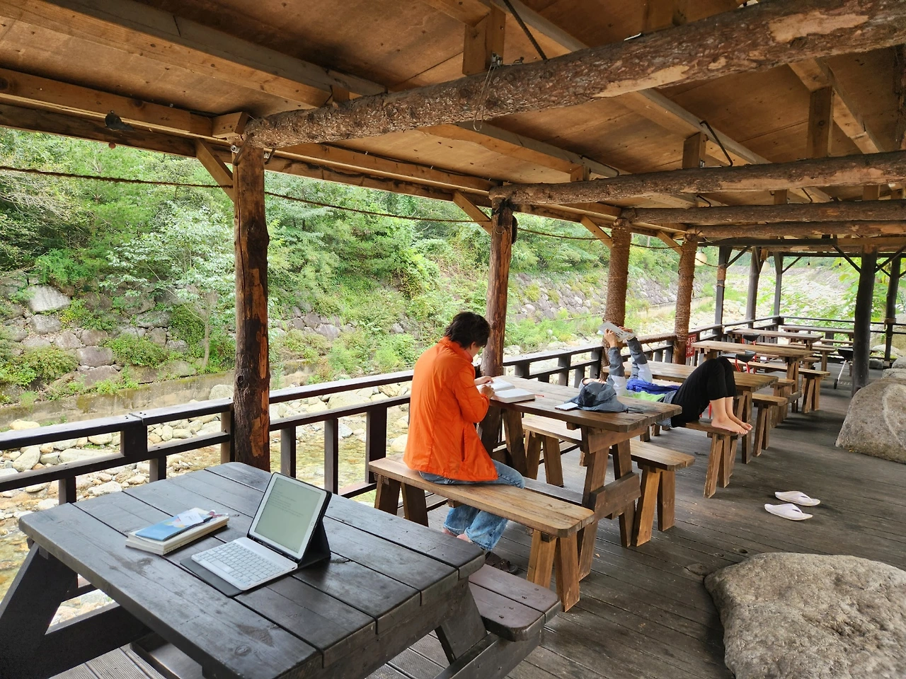 숙소는 계곡가에 나무 벤치와 테이블이 연달아 있는 사진을 보고 예약했던 터,