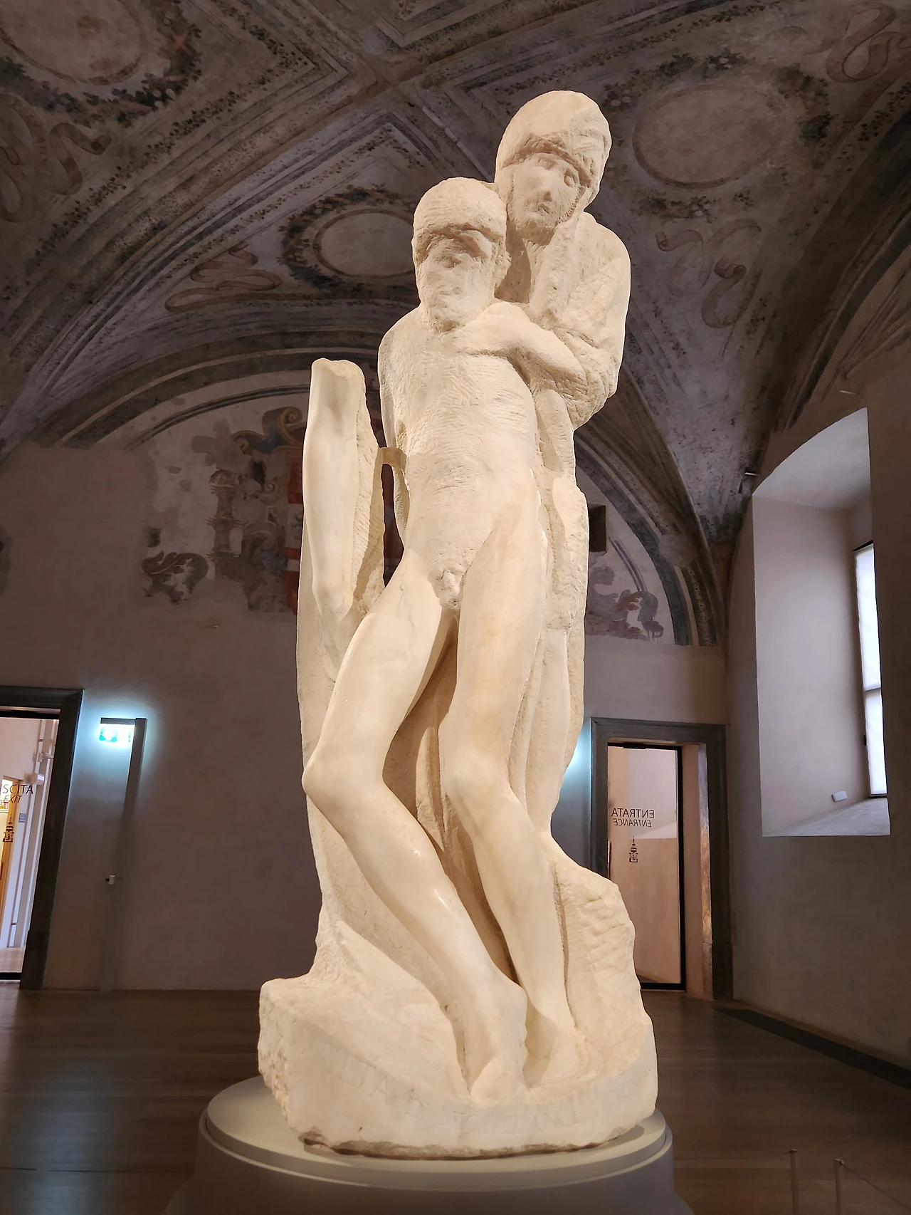 로마의 피에타는 미켈란젤로가 20대 때 제작한 것이고 이 피에타는 미켈란젤로의 80대, 죽기 6일전까지도 작업하다 끝을 보지 못한 작품이다.