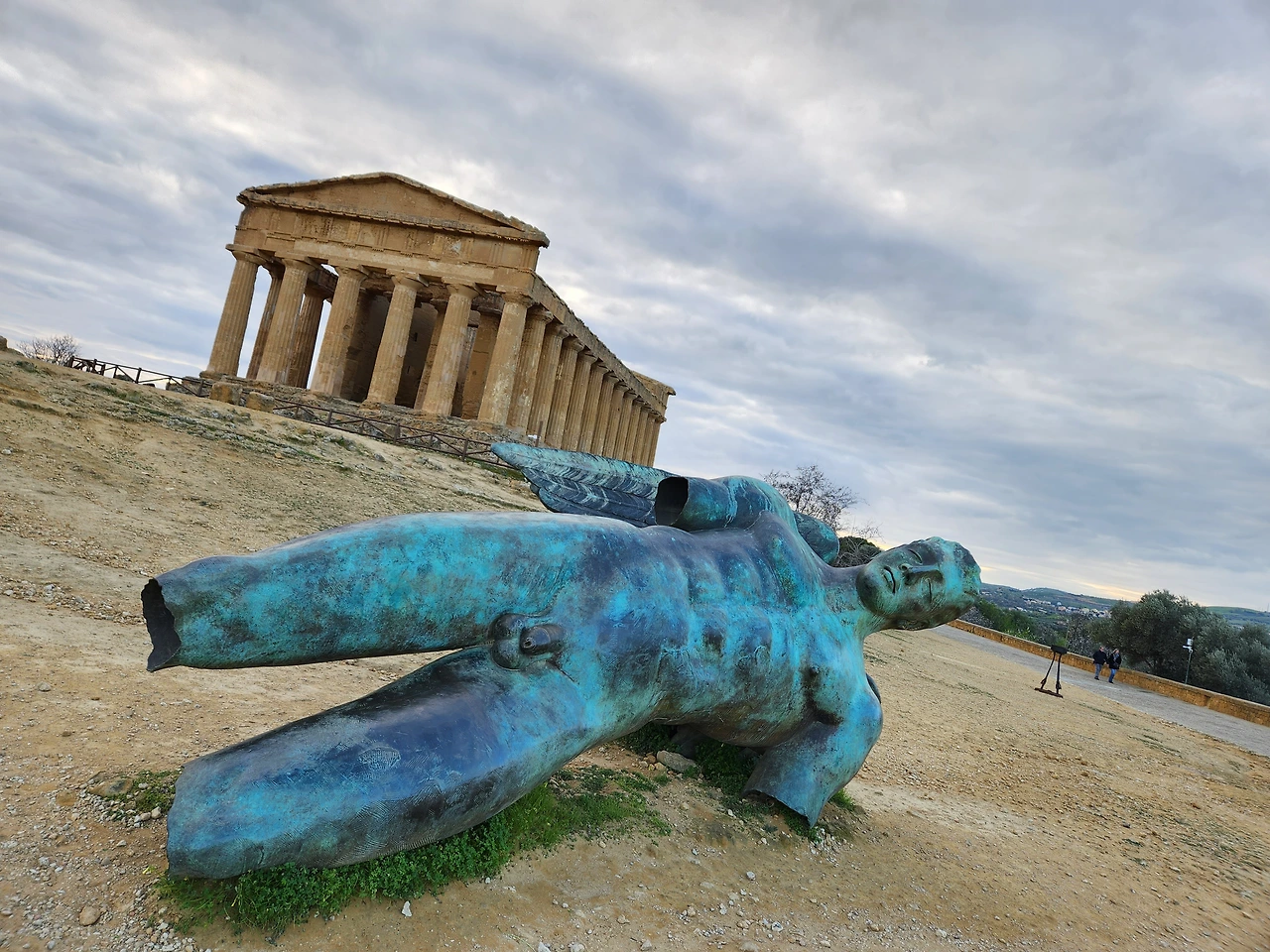 콩코르드 신전 앞에 태양에 너무 가까이 날아가 날개가 녹아 추락한 이카루스의 청동상이