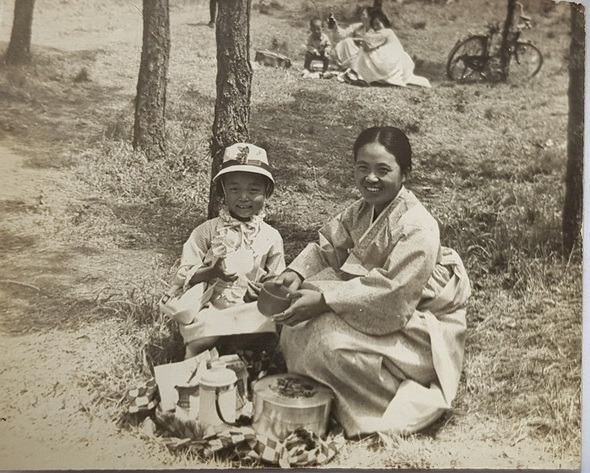 동생 경미가 국민학교 1학년 봄소풍 가서 찍은 사진이다. 엄마는 '옷감장수'아주머니에게 산 옷감으로 만든 한복을 입었다. 오래된 흑백사진이라 보이지 않지만 연한 분홍바탕에 작게 반짝거리는 무늬가 있다. 소풍날 입을 거라는 말에, 새로 나온 원단인 데다 봄에 잘 어울릴 거라며 보따리 아래쪽에서 꺼내 추천한 것이다. 그날 나도 옆에 있었다. 찬합과 물병을 싸 온 밤색과 베이지색 바둑무늬 면보자기도 그날 자투리천을 서비스로 받은 것이다.