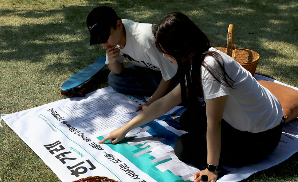 신문돗자리에는 지구를 위해 함께 나눌 토크 주제를 기사로 담아 돗자리 위에서 휴식을 취할 동안 환경에 대한 기사들을 읽어보고 함께 지속가능한 환경에 대해 이야기를 나눌 수 있도록 하고 있는데요.