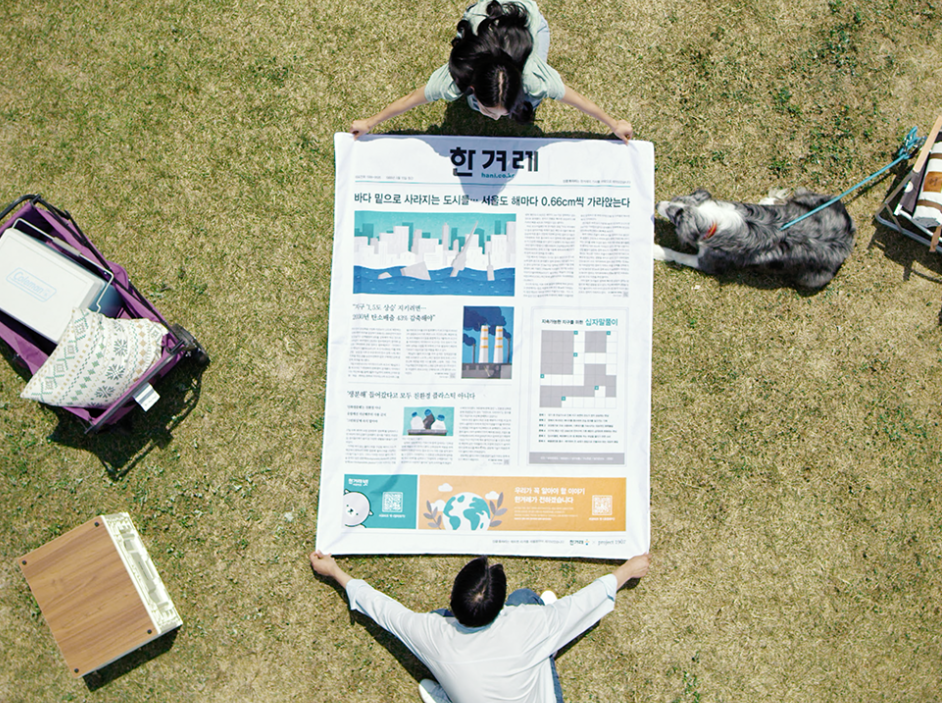 한겨레신문은 폐자원을 재활용하는 업사이클 라이프스타일 브랜드 ‘project 1907’와 함께 버려진 40개의 페트병을 재활용하여 지구의 소식을 담은 신문돗자리를 만들어 한강 시민공원에 무료로 가져갈 수 있도록 캠페인을 추진했는데요.