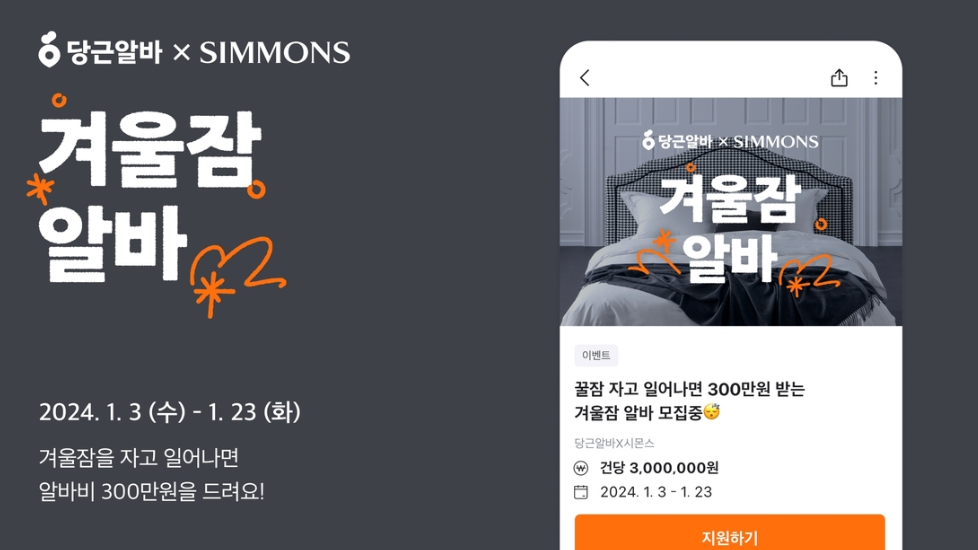 우스갯소리로 '잠만 자도 돈을 벌고 싶다'라고 이야기하잖아요. 실제로 시몬스와 당근알바가 잠만 자도 돈을 벌고 싶은 청년들의 로망을 알바를 통해 실현시켜 준 거예요. 시몬스의 겨울잠 알바는 경쟁률이 치열한 것뿐 아니라 시몬스 침대에서 잠만 자도 시급 300만 원을 받는다는 소식이 SNS를 통해 퍼지면서 엄청난 바이럴 광고 효과도 얻었어요.