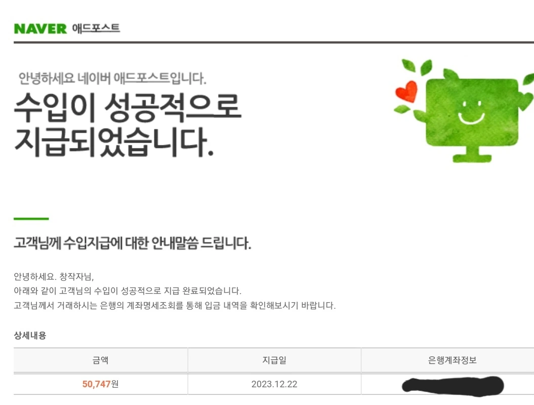 본격적으로 시작하고 약 3개월이 지나고 나서 애드포스트 수익금이 5만원이 입금되었어요!