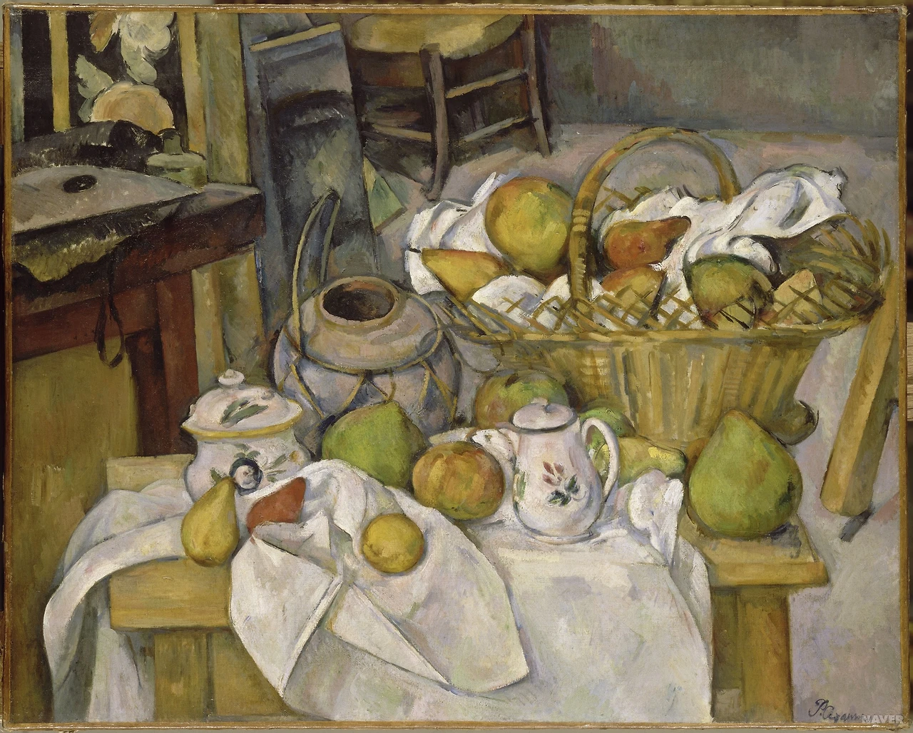 과일바구니는 위에서 바라본 시점이지만 바구니의 몸통은 정면에서 바라본 시점이다. 옆의 회색 단지도 위에서 바라본 시점이지만 하얀 단지와 주전자는 회색 단지보다 약간 아래에서 바라보았다. 그런데 사과나 배들은 옆에서 바라본 시점을 하고 있다.