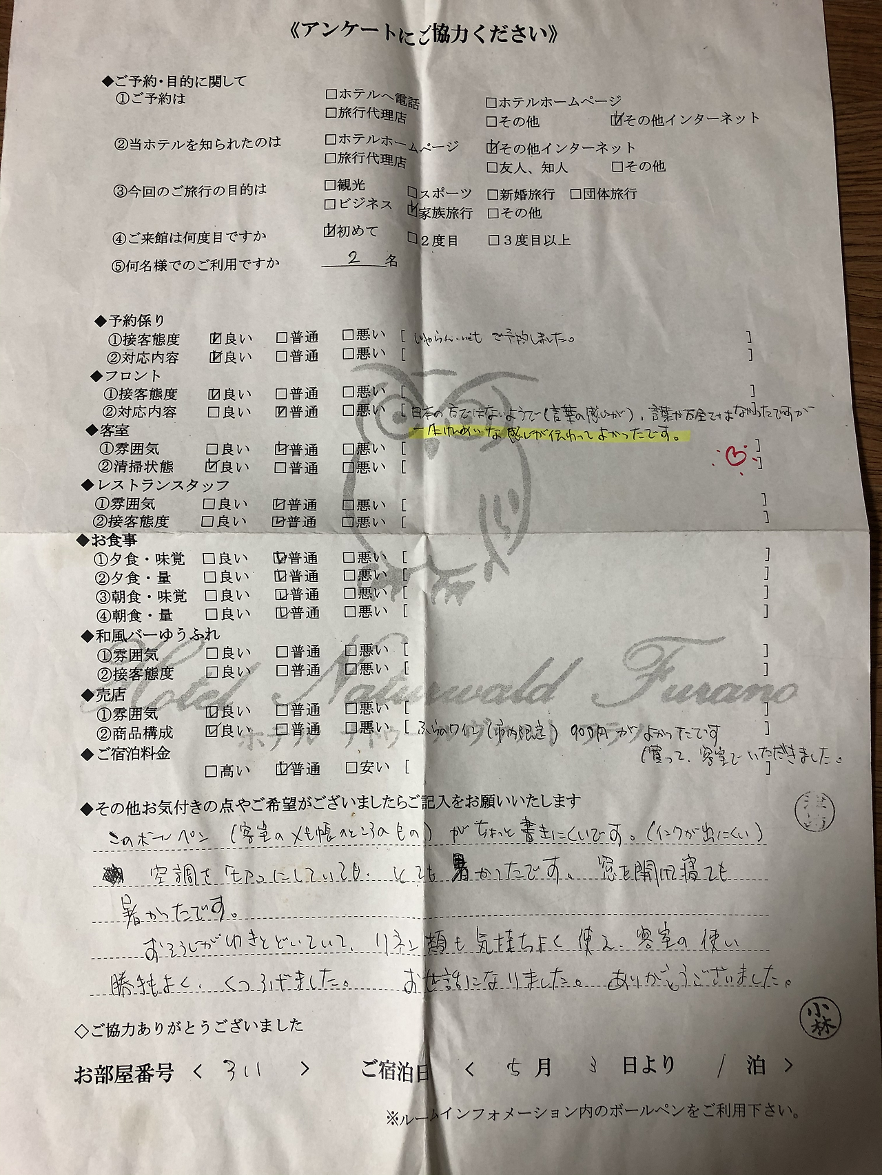 그러던 어느 날 여전히 떨리는 손으로 체크인 업무를 해내고 있던 중 과장님이 큰 종이 한 장을 선물이라며 가져다주셨다. 이게 뭐지? 하고 종이를 받아 들어 봤더니 우리 호텔의 앙케트 조사지였다. 우리 호텔 앙케이트 조사지에 손님이 나에 대한 코멘트를 하나 써주셨는데 너에게 기념이 될 거라며 그 에이포 크기의 앙케이트지를 확대복사 해서 큼직만 해진 종이를 펄럭 펄럭 거리며 가져오셨다. 그 앙케트 조사지에는 이렇게 적혀있었다.