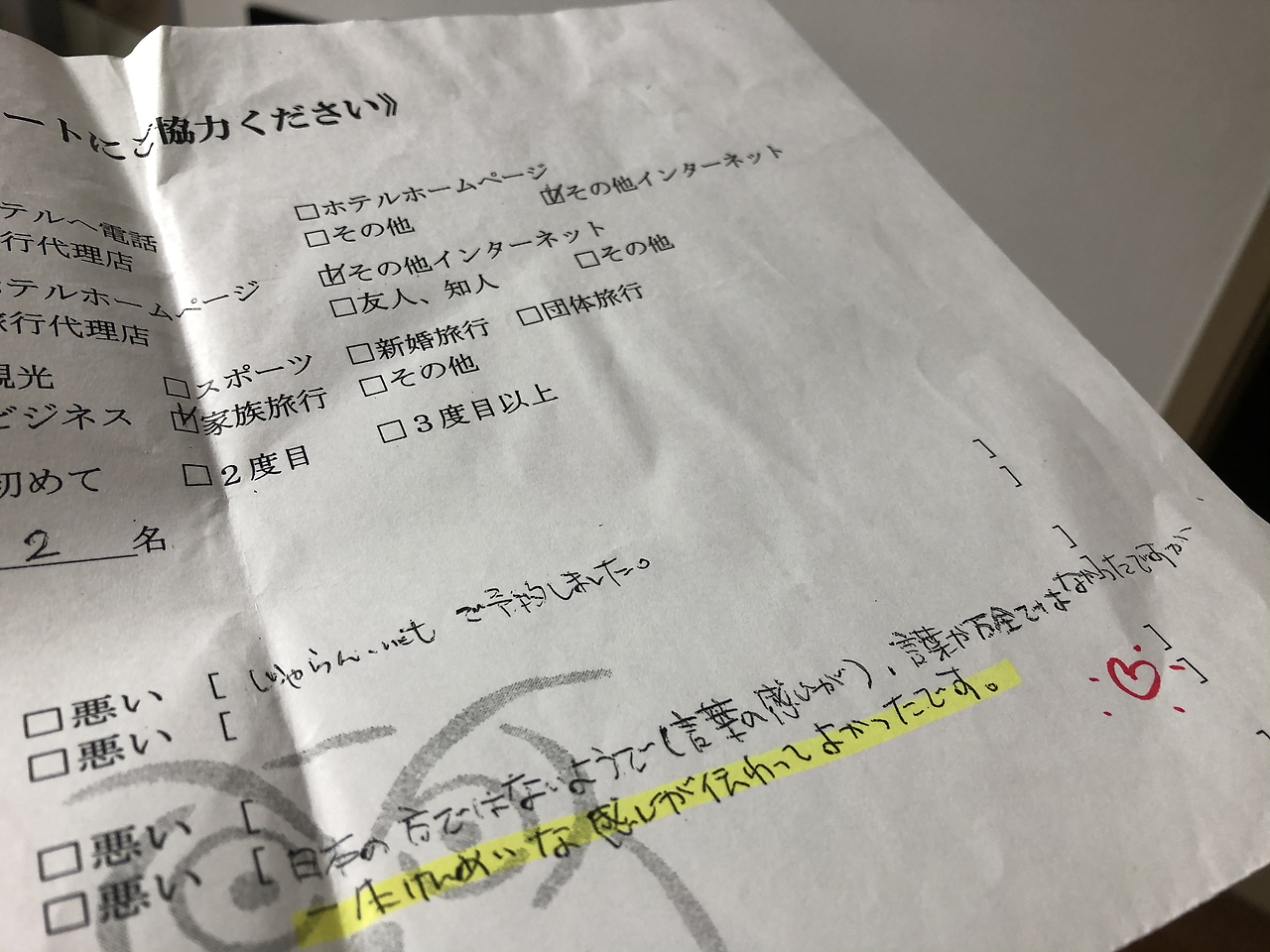 지금도 이 확대 복사된 앙케이트 용지는 우리 집 보물상자 안에 꼭꼭 간직되어 있다. 가끔 집에 와서 꺼내 보면 그때 생각이 나서 미소가 지어진다. 진심은 어떻게든 통하게 돼있어!라는 말을 믿게 된 건 그 때 부터였을까? 일본어가 완벽하진 않았지만 그 진심이 통했던 그때 그 손님의 코멘트는 아직도 내 마음속에 콕 저장되어 있다. 그 코멘트 옆에 같이 그려주셨던 하트 표시까지-