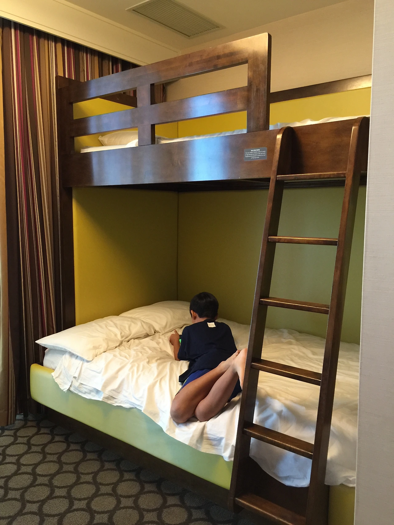 마침 바로 앞 하얏트 호텔에서 프로모션을 하고 있어서, 킹사이즈 베드 1개와 2층 침대가 들어있는 키즈 스위트룸을 반값에 예약할 수 있었다. 그래도 비교적 미국의 호텔들은 침대가 큰 편이라 그동안 묵었던 2개의 퀸침대가 있는 방들이 크게 불편하진 않았지만, 오래간만에 넓은 공간에서 편하게 지낼 생각을 하니 왠지 벌써 피로가 풀리는 느낌이다.