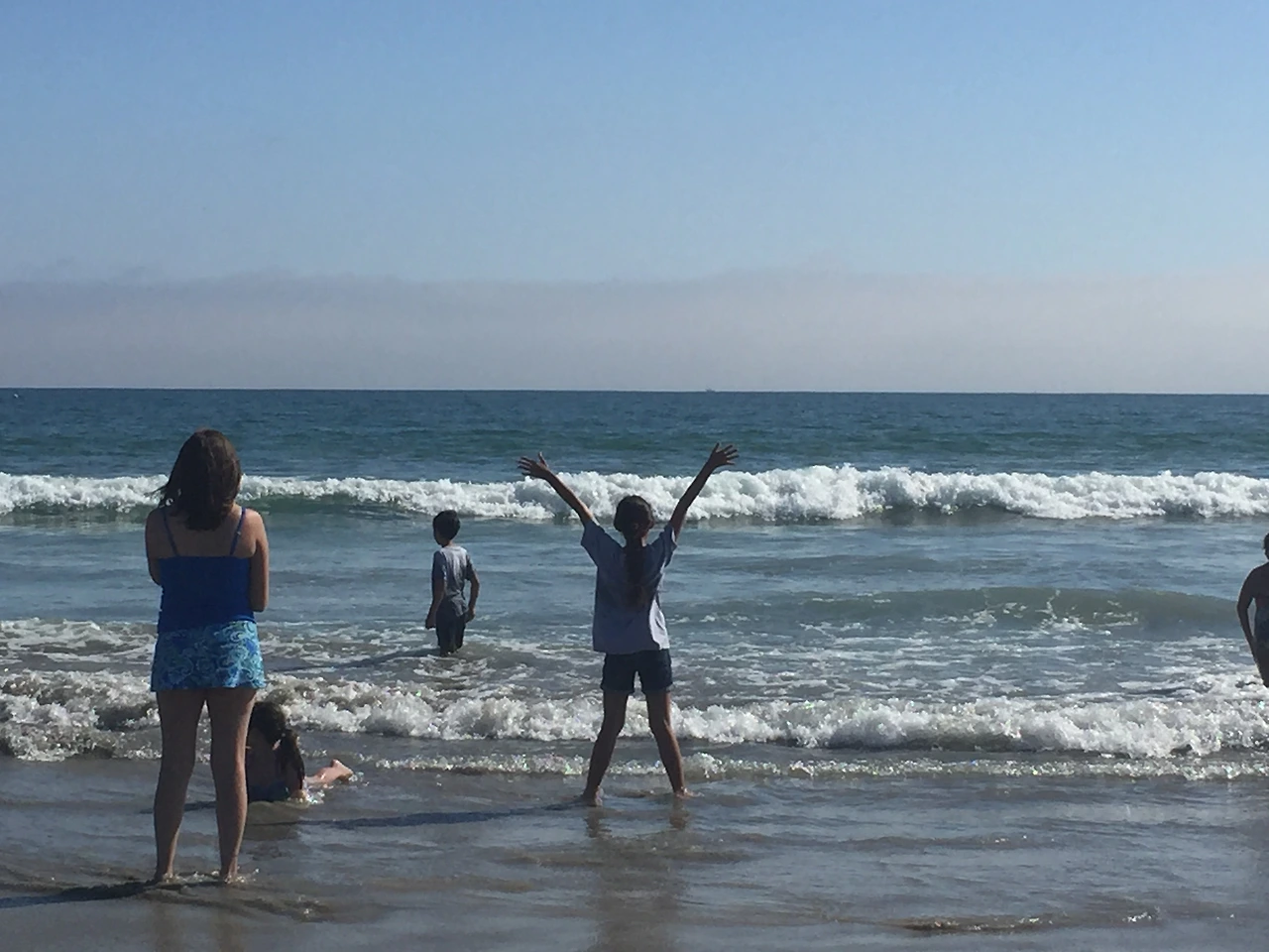 아이들은 신나서 물에 뛰어들어 파도를 타며 놀았다.