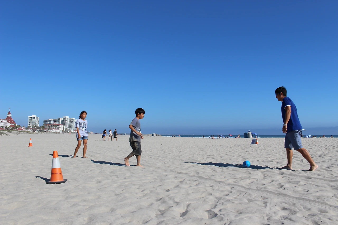 한참을 물속에서 놀던 아이들은 아빠와 같이 모래 위에서 축구공을 차기 시작했다.