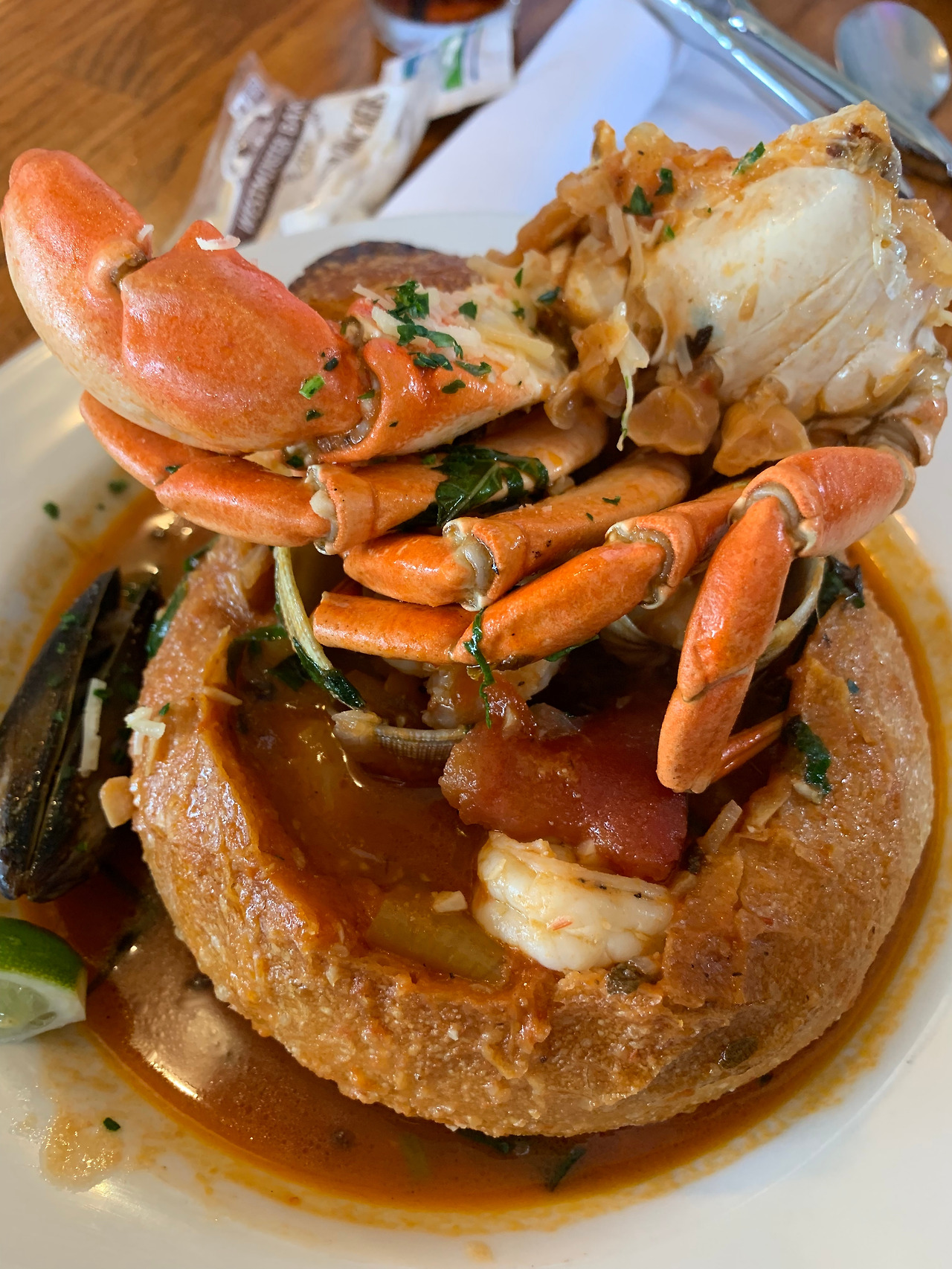 시원한 생맥주 한잔을 시키고, 킹크랩과 성게알을 시켰다. 대기하는 동안 옆에 앉아 함께 수다를 나누었던 사교성 넘치던 멕시칸 아줌마가 한 달에 한 번은 꼭 이걸 먹으러 두 시간 거리를 달려온다고 강추한 '차피노'라는 음식도 시켰다. 해산물이 잔뜩 들어간 매콤한 토마토 수프가 사워도우 안에 들어있었는데, 이게 너무너무 맛있었다. 과연 두 시간 거리를 매달 운전해 올만 하다!