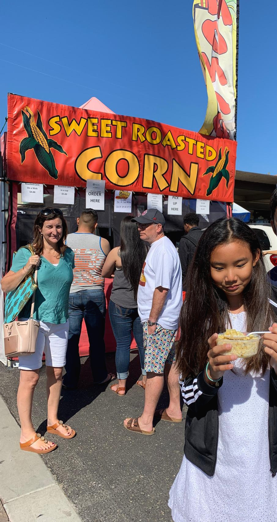 사람들이 북적이던 옥수수 가판대에서 우리도 줄을 서 구운 옥수수를 샀다.
