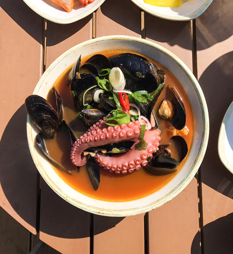 문어라면의 비주얼은 내가 상상하던 바였다. 튼실한 문어 다리가 라면 위에 아름답게 자리잡고 있었고, 그 밑에는 여러가지 해물이 라면면발과 뒤엉켜 있었다. 왠지 라면에서 제주바다 냄새가 나는 것 같은 착각에 빠졌다. 사실 그런 향은 나지 않았다. 국물을 한 숟갈 퍼서 입으로 가져갔다.