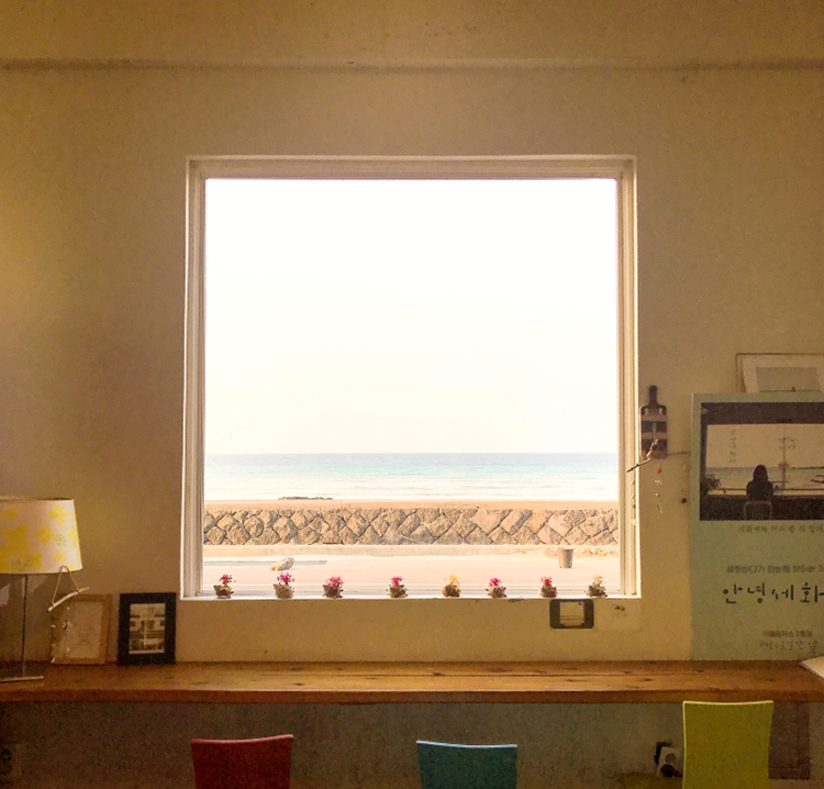 세화바다을 닮은 카페 공작소는 바다를 향해 앉아있다. 커다란 창문이 카페 내부를 바다에게 휜히 보여주고 있었다. 낮은 나무 계단을 올라가 옆으로 문을 끼익 하고 열니, '절대정숙'이라는 말이 눈에 띄었다.