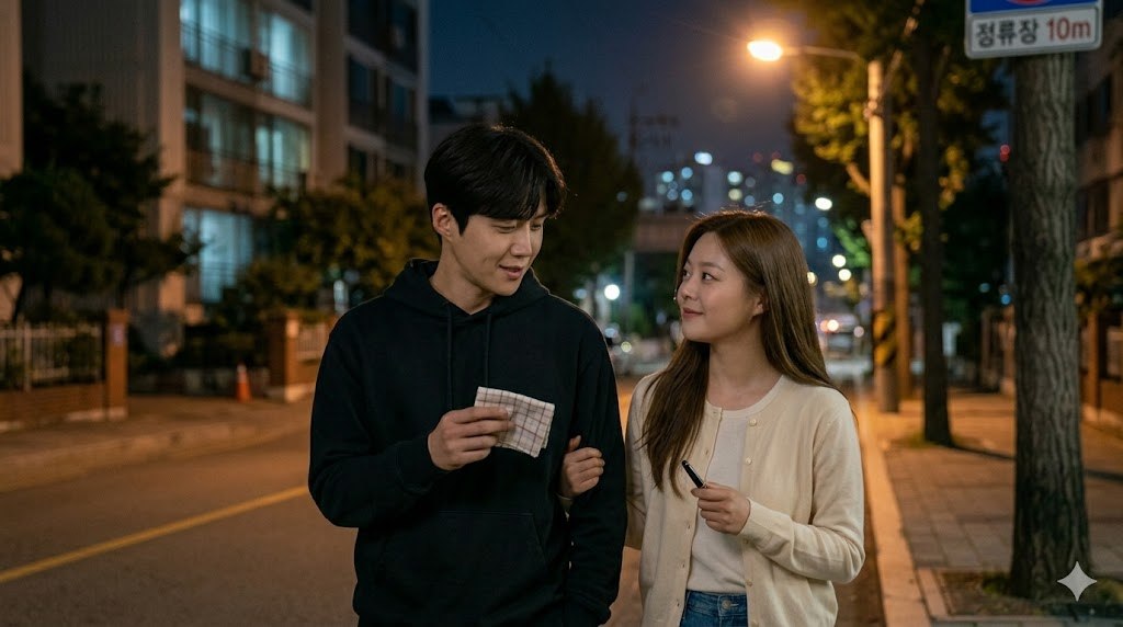 정류장은 아직 조금 남아 있었고, 가로등 불빛이 두 사람 사이를 조용히 비추고 있었다.