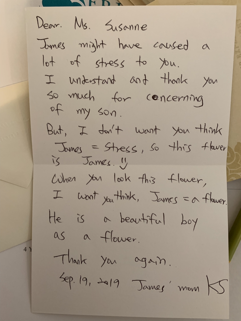 이렇게 우리 아들 제임스를 통해 한 달 동안 끓였던 마음은 언제나 그렇듯 많은 깨달음과 지혜, 삶을 가르쳐 주어 이 또한 감사하다. 이 글이 끝날 때쯤 나는 아이들을 데리러 가기 전 꽃 3송이를 살 참이다. 그리고 한 달 동안 우리 아이를 위해 마음 끓이며 스트레스받은 선생님들에게 제임스를 떠올리며 스트레스를 떠올리지 말고 이렇게 예쁜 꽃이라고 연결시켜달라고,
