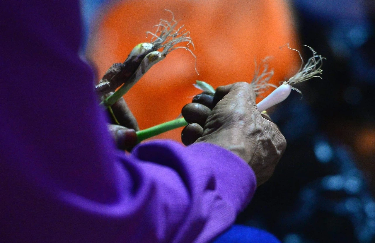 경복궁 지하철 역 인근에서 파, 상추 등을 다듬고 계시는