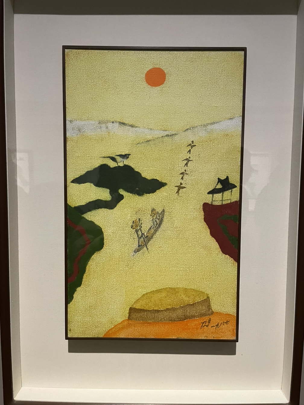 딱 한 점, 비슷한 색을 쓴 그림이 떠오르는데 장욱진의 강(1987년 작, 아래 그림)이다. 2024년 국립현대미술관에서 있었던 전시, 장욱진 회고전 '가장 진지한 고백'에서 이 작품을 본 적이 있다. 강에 노 저어 가는 배와 사람, 그 위에 뜬 달 또는 해와 절벽의 정자는 이 서양화가가 차용했을 오래되고 익숙한 동양화 주제를 상기시킨다. 그런데 강임에 분명한 넓은 배경은 연두색, 그것도 형광 연두에 가깝다. 나는 이런 색 강을 상상하기 어렵다. 장욱진 그림은 훌륭한 균형감을 가진 비대칭 형상이 주는 조형적 쾌감이 매우 큰데, 한 편으로는 이 작품처럼 대단히 인위적이고 추상적인 색의 사용으로도 내게 만족감을 준다. 여기서는 연두지만 다른 그림에서는 호쾌한 분홍이기도 하다. 분홍을 싫어하는 나도 좋아하게 하는 그런 특별한 분홍. 아마도 그만이 상상하고 조색할 수 있을 그런 개인적인 분홍. 고흐의 연두색은 내게 바로 그런 개인적인 색, 고흐만이 상상하거나 어쩌면 실제로 지각했을 색을 떠오르게 하는 것이다.