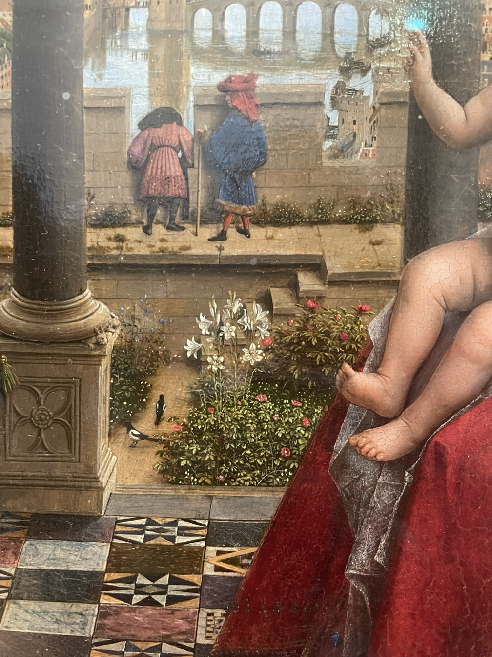 그러나 나를 진정으로 매료시킨 그림은 '롤랑의 성모(위 그림, 1435년 작, 루브르, 파리)'였다. 이 그림에서는 디테일의 끝을 보여주지, 라고 말하는 화가의 말이 들리는 것 같다.