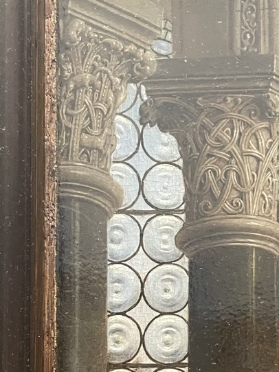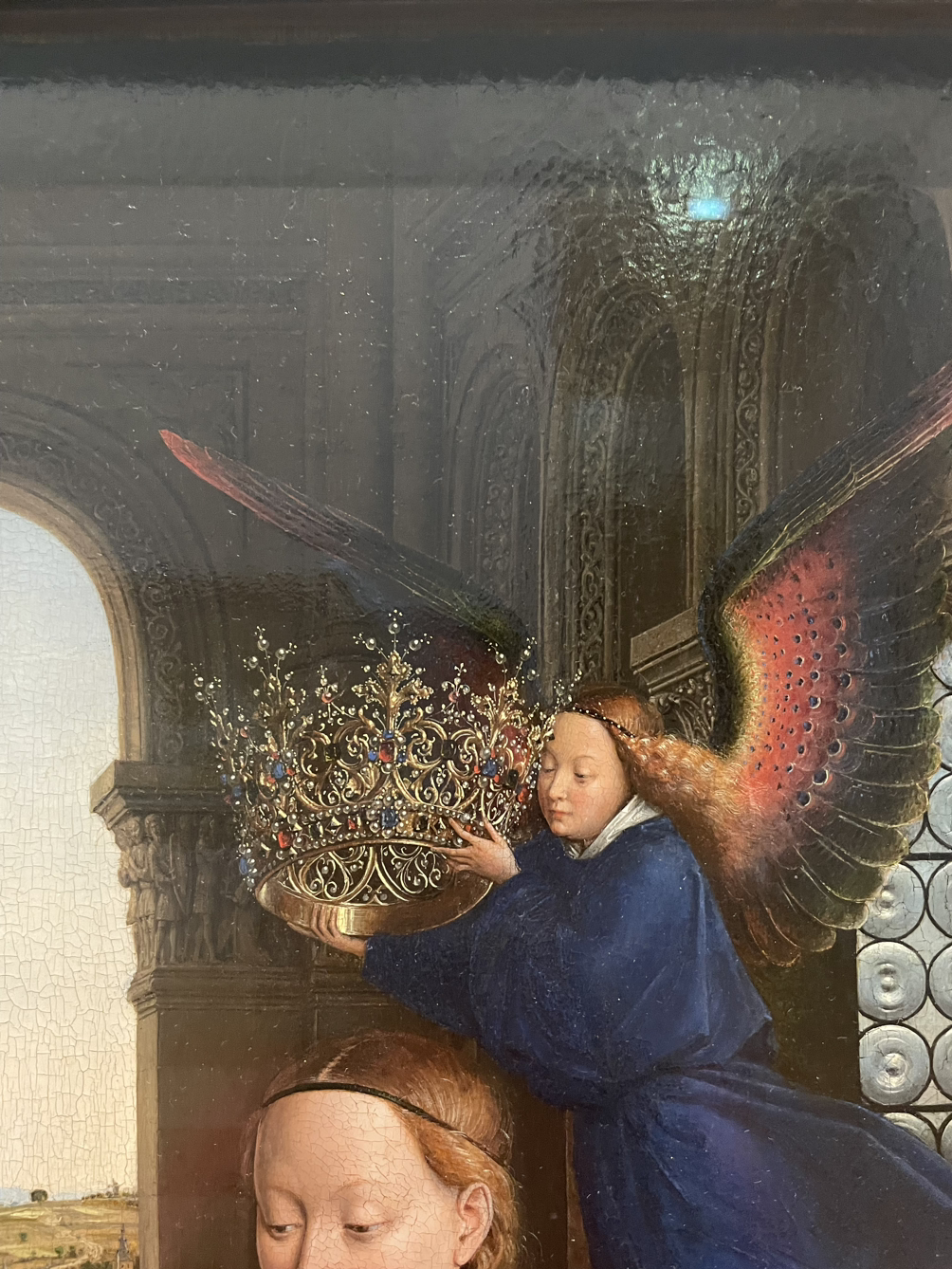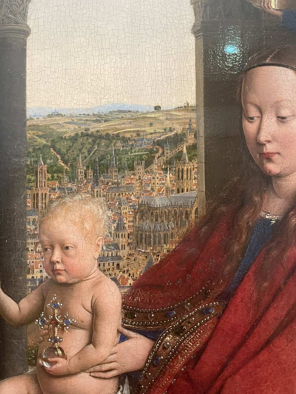 성모 뒤로 펼쳐진 도시 모습이 가장 놀라웠다. 성모 정수리 위에 천사가 든 왕관과 성모가 걸친 로브, 아기 예수가 손에 든 십자가의 화려한 보석이 얼마나 사실적으로 영롱하게 빛나는지, 건물 대리석 기둥머리 조각이 얼마나 정교한지, 그 뒤로 보이는 유리창은 얼마나 우피치의 유리창과 꼭 같이 생겼는지와 같은 감탄은 오히려 뒷전일 정도다. 성 모자와 롤랑이 있는 건물에서 조금 낮은 곳에 있는 것 같은 도시, 뾰족한 첨탑들과 건물 윗부분은 가본 적도 없는 벨기에 어느 광장의 건물들을 떠오르게 한다. 나는 시간 가는 줄도 모르고 건물 하나하나를 헤아렸다. 이국적인 시공간의 이미지를. 그 뒤로 펼쳐진 구릉과 언덕, 더 원경에 흐릿한 산이 표제의 인물들보다 눈길을 끈다. 저렇게 멀리 있는데도 모든 게 선명하다. 오래 보고 몇 번을 돌아와 다시 봐도 더 들여다보고 싶었다. 결코 질리는 법이 없을 것 같은 복잡하고 수많은 디테일들이었다.