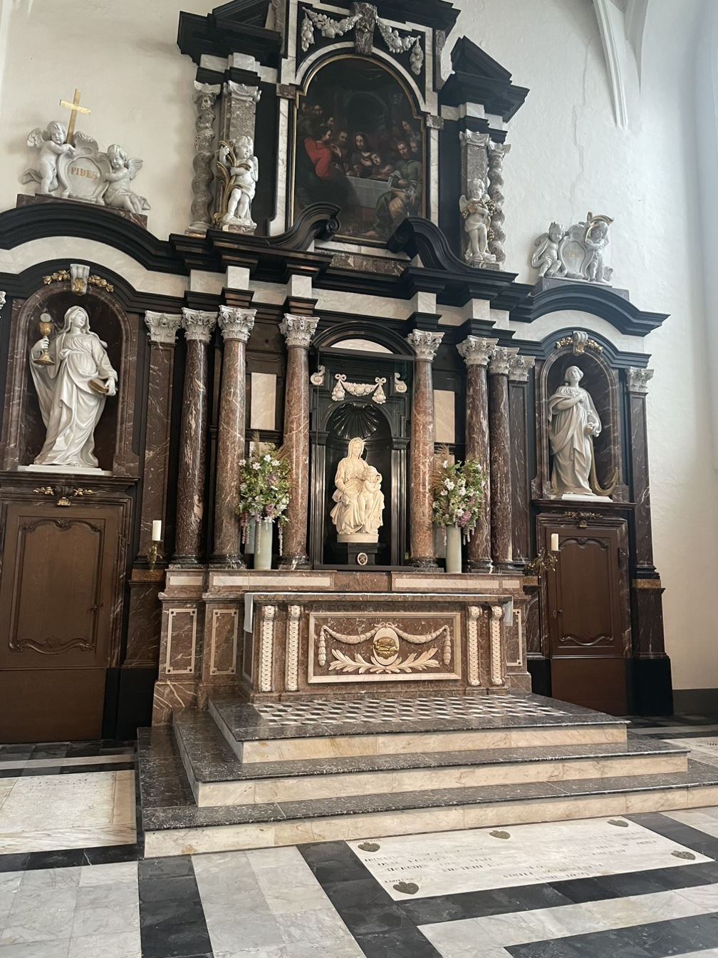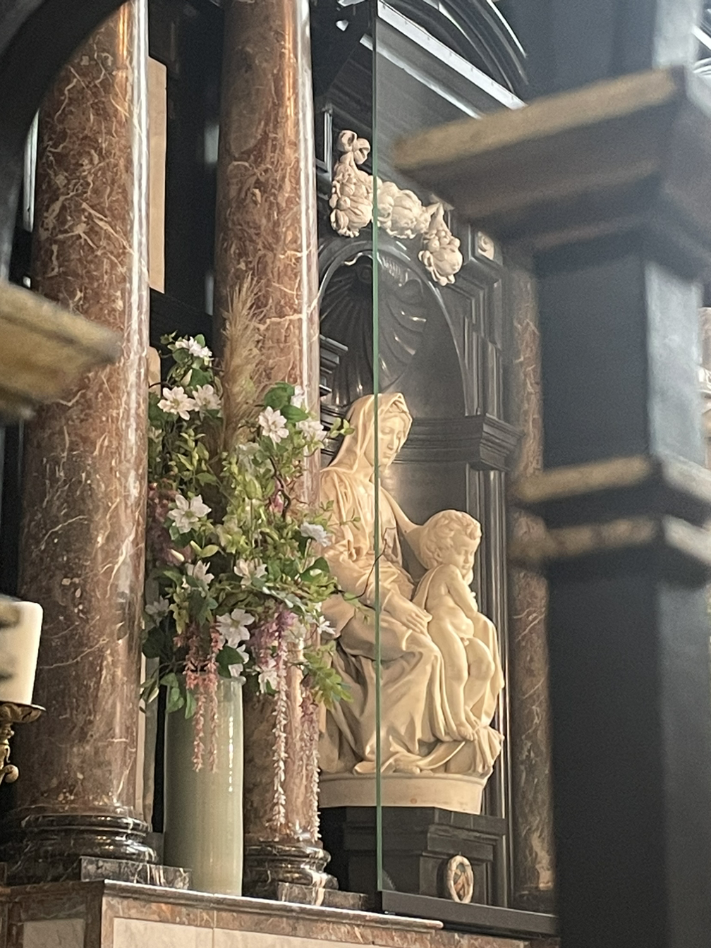 그러거나 말거나 이 성모자상은 여기서 존경받고 사랑받고 있으리라. 주변을 장식한 생화가 오백살도 넘은 조각을 바로 지금과 연결해주고 있었다.
