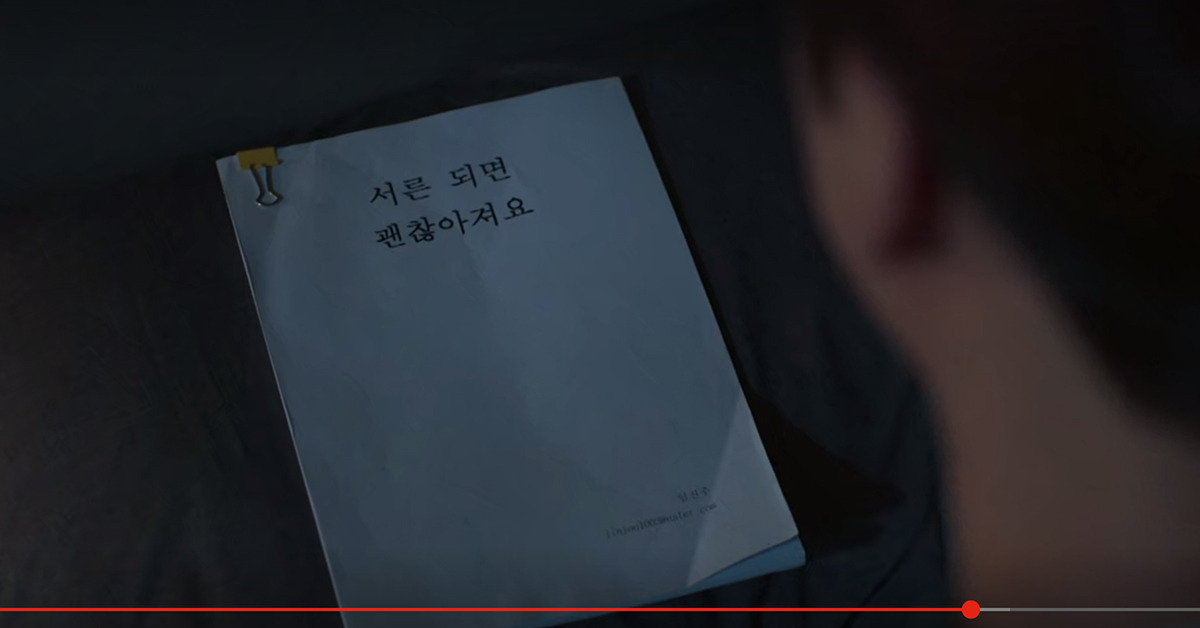 잠자리에 누웠다가 도로 일어난 범수. 대본을 침대로 가져와 펼친다. ‘서른 되면 괜찮아져요’ 대본에는 여러 번 읽은 흔적으로 구김이 생겼다. 그중에도 유독 눈에 띄는 것은, 대본 표지의 오른쪽 아래 귀퉁이의 접힌 자국. 그곳엔 작가의 이름이 적혀있는데, 주름대로 접으면 진주의 이름이 가려진다. 따라서 이 장면은 작품에 대한 범수의 관심 뿐 아니라, 그것을 편견 없이 보고자 하는 그의 태도를 보여주는 듯하다.
