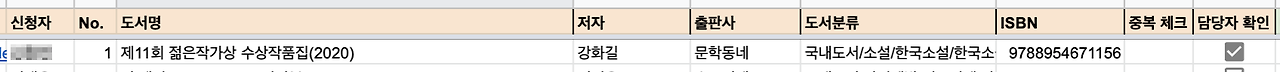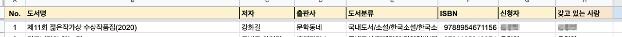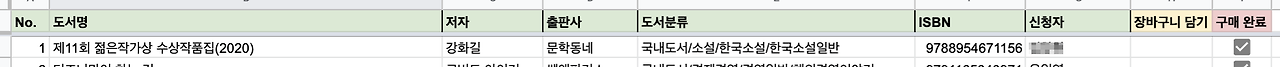 관리자를 위해 (그리고 궁극적으로 모두를 위해) 도서구매목록 시트를 새로 만들었다. 시트는 '관리자용'과 '열람용' 두 가지로 만들었고, 각 시트는 아래와 같은 내용을 포함하고 있다.