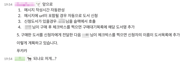 - 신청자는 읽고싶은 책을 슬랙으로 말하면, 끝.