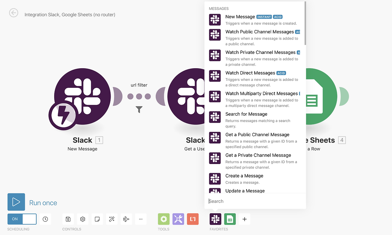 어쨌거나 Integromat 역시 일단 세팅을 해놓으면, 모든 것이 편안해진다. Zapier와 달리 filter를 기본으로 제공하기 때문에, 슬랙 메시지 중에 url만 걸러서 구글 시트로 옮기는 것이 가능해졌다.