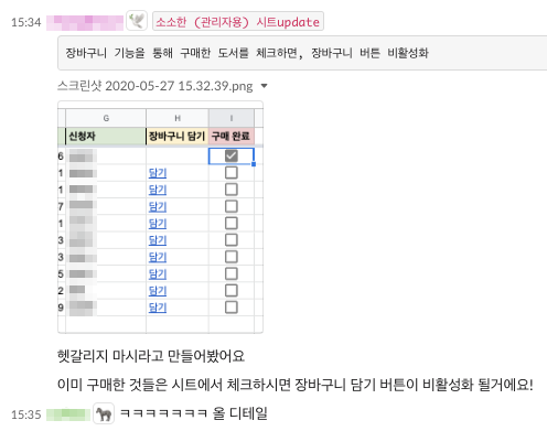 이렇게 두 가지 삽질을 마친 후 완성된 '신청목록' 탭의 모습은 아래와 같다. 신청자 이름은 '슬랙 메시지 log' 탭에서 그대로 가져오고, 나머지 정보는 교보문고 페이지에서 자동으로 불러온다.