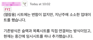 2. 기존 구글 시트는 슬랙 메시지를 받고, 임시 저장하는 시트로만 활용.