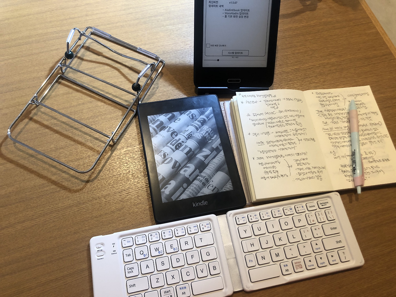 카페에 들어간다. 커피를 주문하고 자리를 잡는다. 오늘 뭐할지 정하고 가방을 뒤진다. 블로그에 글 쓰는 날은 핸드폰 거치대와 키보드를, 종이책 읽는 날은 독서대와 책을, 전자책 읽는 날은 핸드폰 거치대와 이북 리더기를 꺼내놓는다. 카페에 앉아 그 날 할 일을 시작하는 데까지 걸리는 시간은 5분 안쪽.