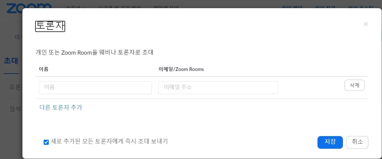 둘째, 발표자 관리다. 발표자란, 웨비나를 생성한 다음 하단의 [초대] 메뉴에서 [토론자]로 추가한 사람을 의미한다. 토론자 메뉴 우측의 [편집] 버튼을 누르면 이름과 이메일을 입력할 수 있다. 세미나의 발표자는 물론, 주최측 입장으로 Q&A 답변 등을 진행할 사람을 모두 추가해두는 편이 좋다.